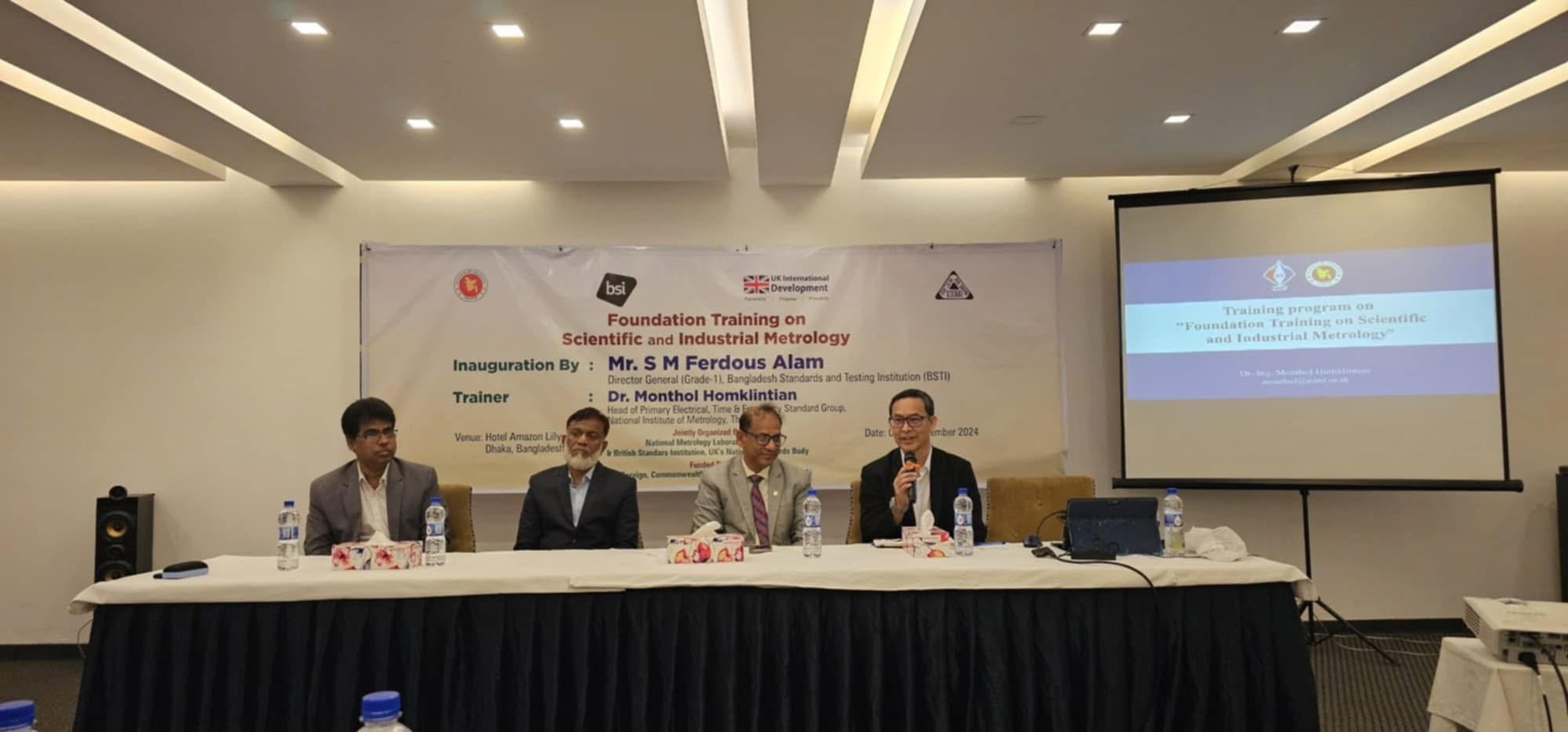 Dr. Monthol Homklintian, Group Leader of the Primary Electrical, Time and Frequency standards in Electrical Metrology Department, was invited as a lead trainer for the “Foundation Training on Scientific and Industrial Metrology” held on 8 – 12 December 2024 in Bangladesh. This training program was organized in collaboration with the Bangladesh Standards and Testing Institution (BSTI) and the British Standards Institute (BSI) which aimed to enhance participants’ metrological knowledge encompassing both theorical aspects and practical applications.