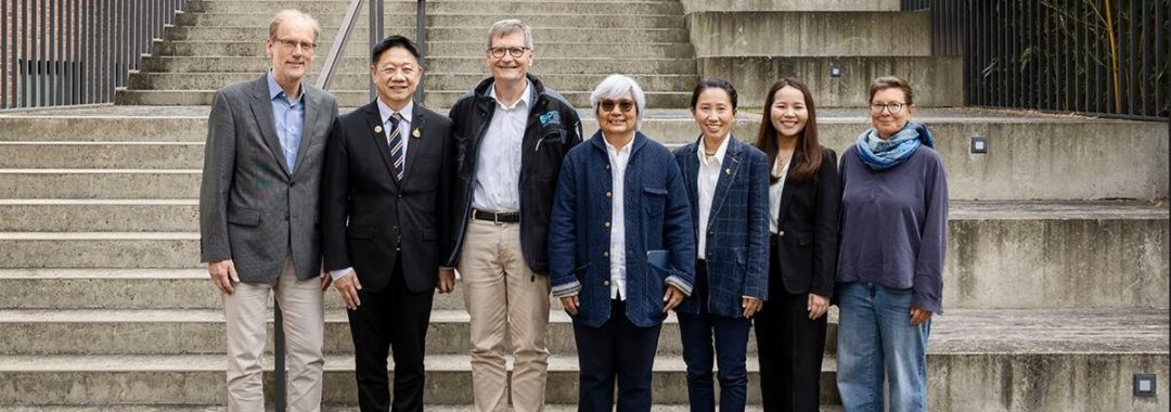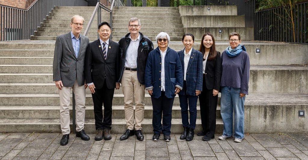 Group Photo: (from left to right) Uwe Miesner, Head of the Asia Section; Pol.Lt.Gen. Pornchai Suteerakune, Director of NIMT; Dr. Frank Härtig, Vice President of PTB; Dr. Sivinee Sawatdiaree, Head of the Electrical Metrology Department; Dr. Jariya Buajarern, Expert Metrologist and Head of the International Relations Office; Thanakporn Nontachart, International Relations Officer; and Jana Koerner in front of the Kohlrausch Building at PTB in Braunschweig.