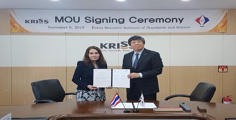 The MoU to foster further collaboration was signed by NIMT Director Mrs. Ajchara Charoensook and KRISS President Dr. Sang-Ryoul Park. NIMT and KRISS have built a partnership through cooperation under the MoU since 1997. The aims of this MoU is to strengthen relations between both institutes. Forms of cooperative activities include; (1) Inter-laboratory comparision of measurement standards (2) Implementation of joint researches (3) Exchange of guest researchers, technical information, materials and publication and (4) other activities.